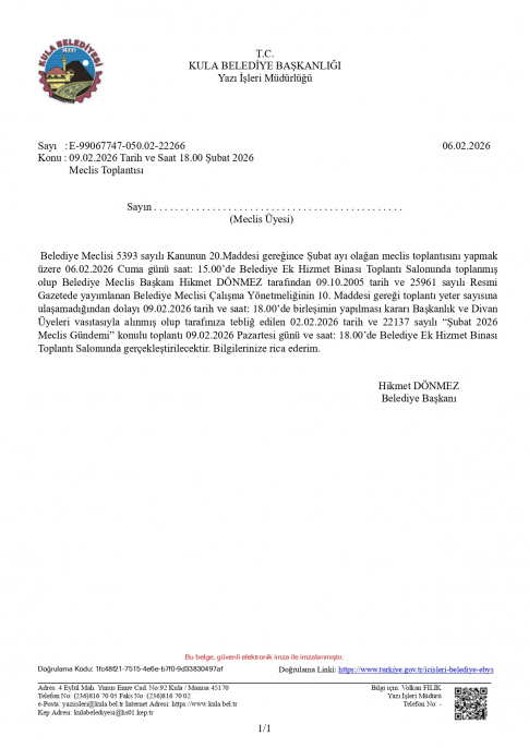 Kula Belediyesi 2026 Yılı Şubat Ayı Meclis Toplantısı, 09 Şubat 2026 Pazartesi günü saat 18.00'da düzenlenecektir. Toplantı ile ilgili çağrı yazısı ekte yer almaktadır.